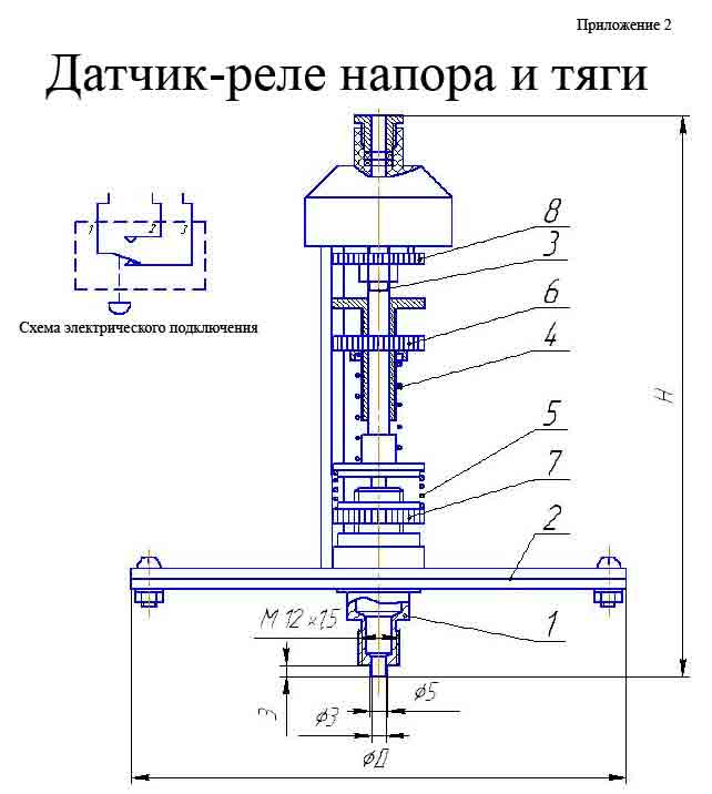 Принцип действия датчика-реле напора и тяги основан на уравновешивании силы создаваемой давлением контролируемой среды начувствительный элемент (мембрану) силой упругой деформации пружины. Контролируемая среда через штуцер (1) подается в камеру чувствительного элемента (2) и создаваемое при этом усилие передается через мембрану и шток (3) на пружину (4) (при контроле напора) на пружину (5) (при контроле тяги). Натсройка необходимой уставки напора производится вращением маховика (6). При вращении маховика (6) по часовой стрелке, уставка увеличивается, протв часовой стрелки-уменьшается. Настройка необходимой уставки тяги, производится вращением маховика (7).При вращении маховика (7) по часовой стрелке уставка уменьшается, против часовой стрелки-увеличивается.